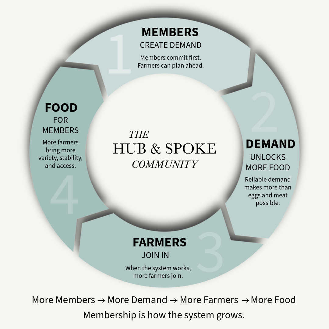 The modern food system is highly centralized and increasingly fragile. When disruptions occur, local access to real food is often the first thing lost. This membership exists to help build a parallel food economy—one where communities are fed first by nearby farms and processors, not dependent on distant, centralized supply chains. It is a collective response to a system that no longer prioritizes local resilience. This is not about perks or convenience. It is about protecting local food access and rebuilding the foundations that make it possible.